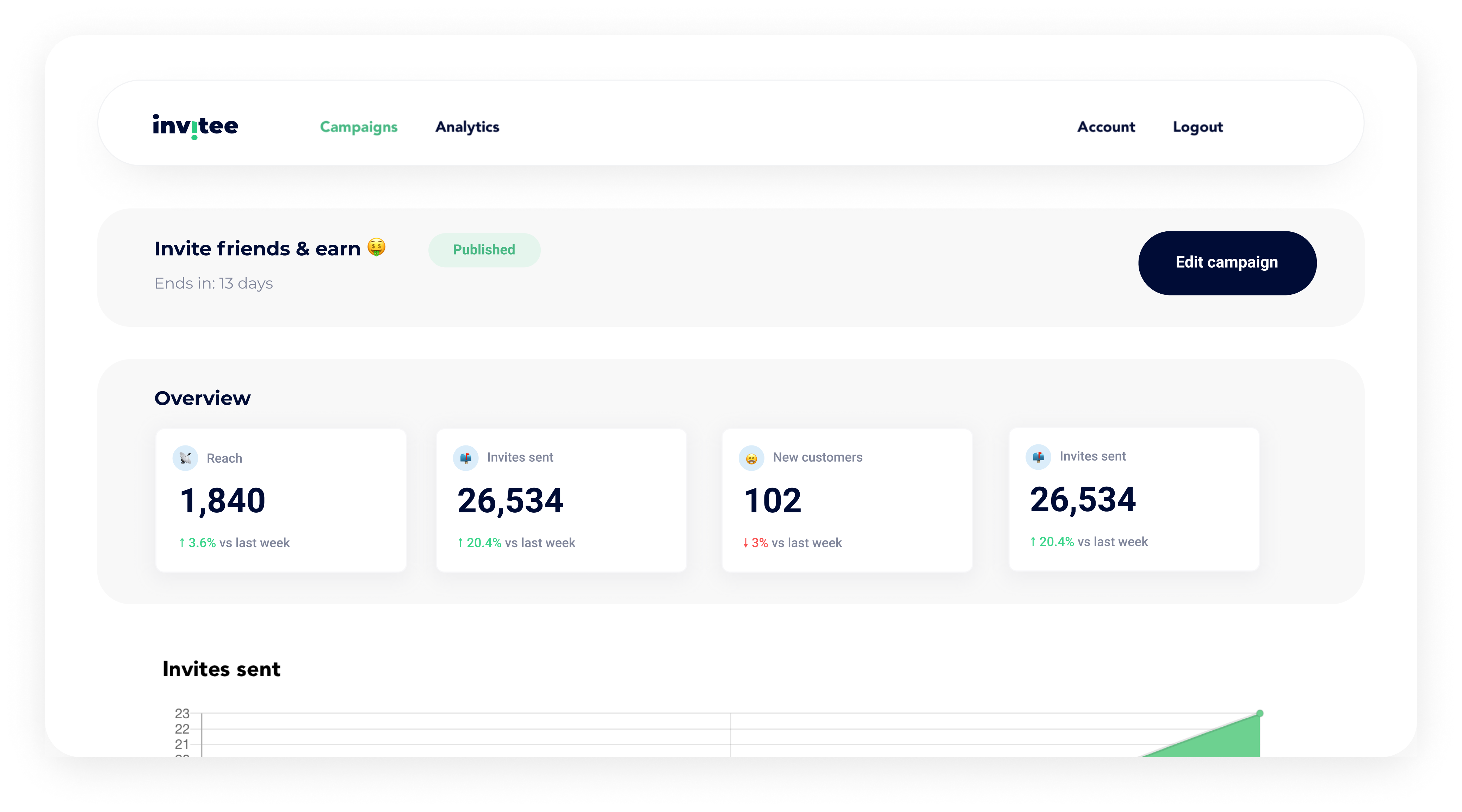 Complete visibility on campaign performance. Views, invites sent, new customers gained, all instrumented.